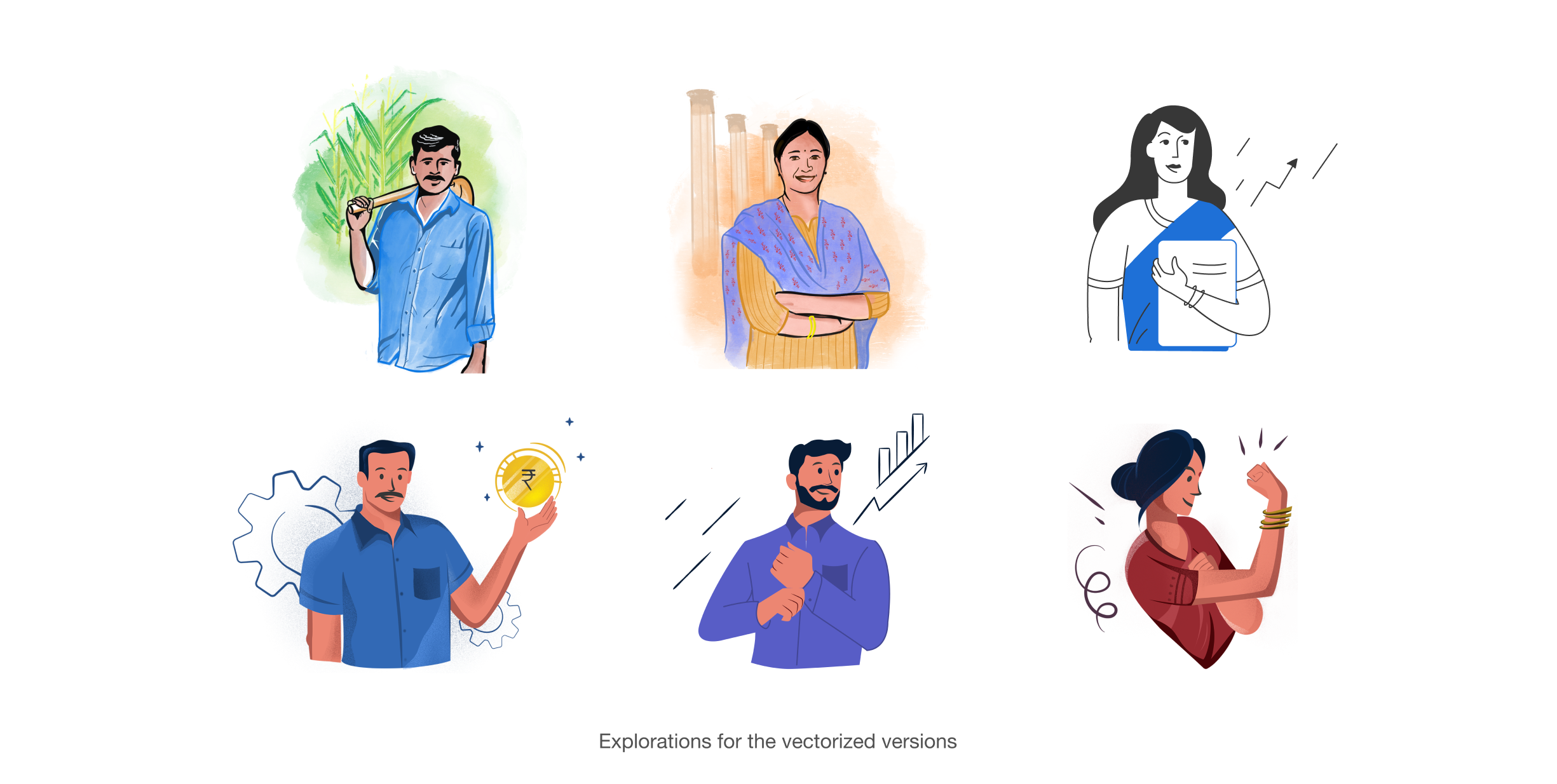 My approach was centered on understanding the core values of Kinara Capital and the needs of its target audience. The goal was to create designs that were not only visually appealing but also resonated with the Indian small and medium business owners. Each of the character illustrations were created keeping in tone and messaging of the website, and the target audience which is the indian small and medium business owners.